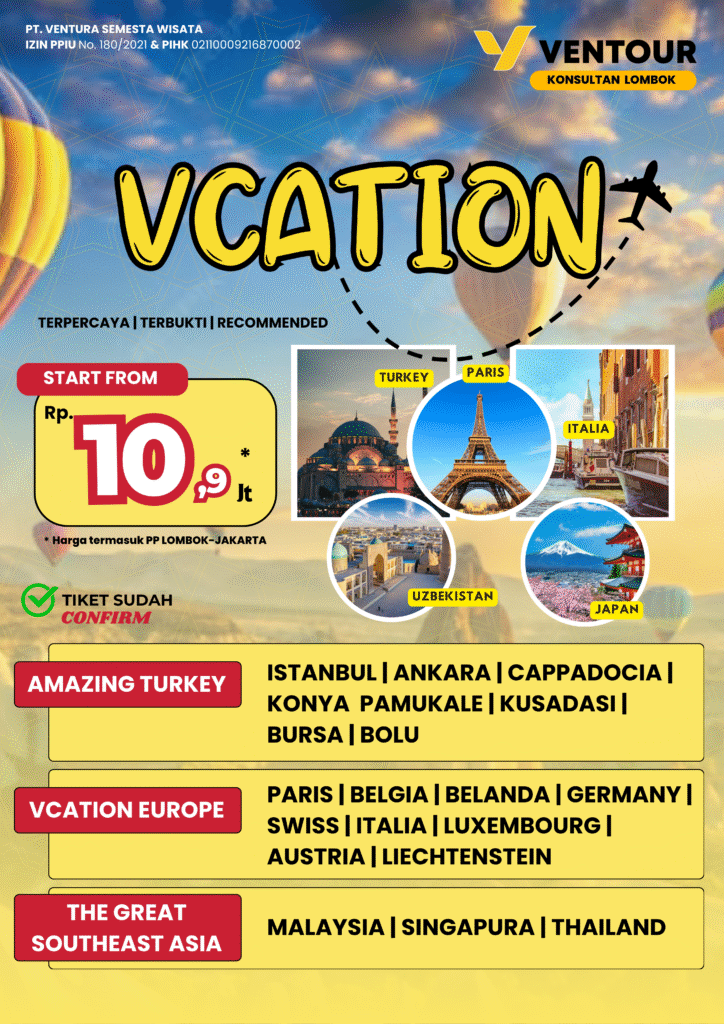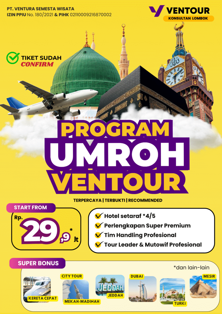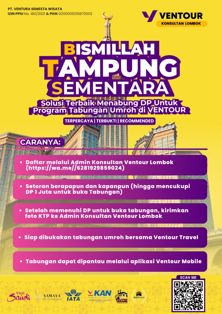 Kami adalah Tim KONSULTAN VENTOUR LOMBOK, yang dibentuk oleh konsultan resmi dari VENTOUR TRAVEL yang telah memiliki izin Penyelenggara Perjalanan Ibadah Umrah (PPIU) resmi dari Kementerian Agama Republik Indonesia. Kehadiran kami di NTB adalah wujud komitmen untuk mendampingi masyarakat Lombok dan sekitarnya dalam mewujudkan niat suci menuju Baitullah dengan tenang, aman, dan nyaman.