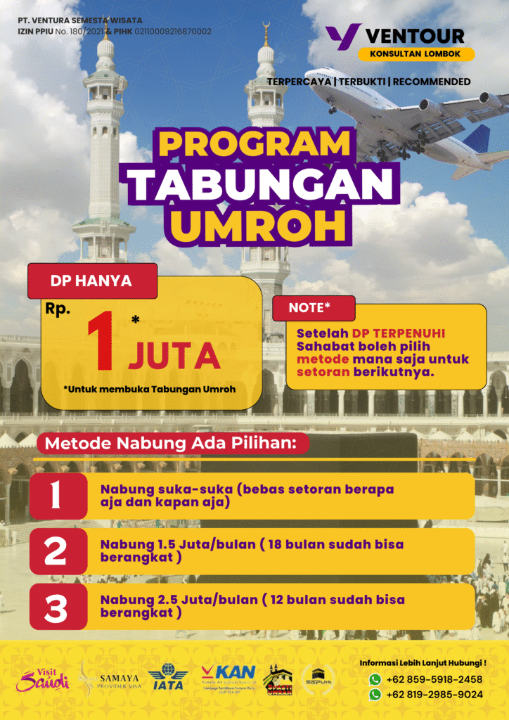 Setiap sahabat yang mendaftar umroh melalui Tim KONSULTAN VENTOUR LOMBOK, secara langsung ikut berkontribusi dalam pendanaan program ini. Dengan demikian, keberangkatan jama’ah tidak hanya menjadi ibadah pribadi, tetapi juga menjadi amal jariyah yang pahalanya terus mengalir.